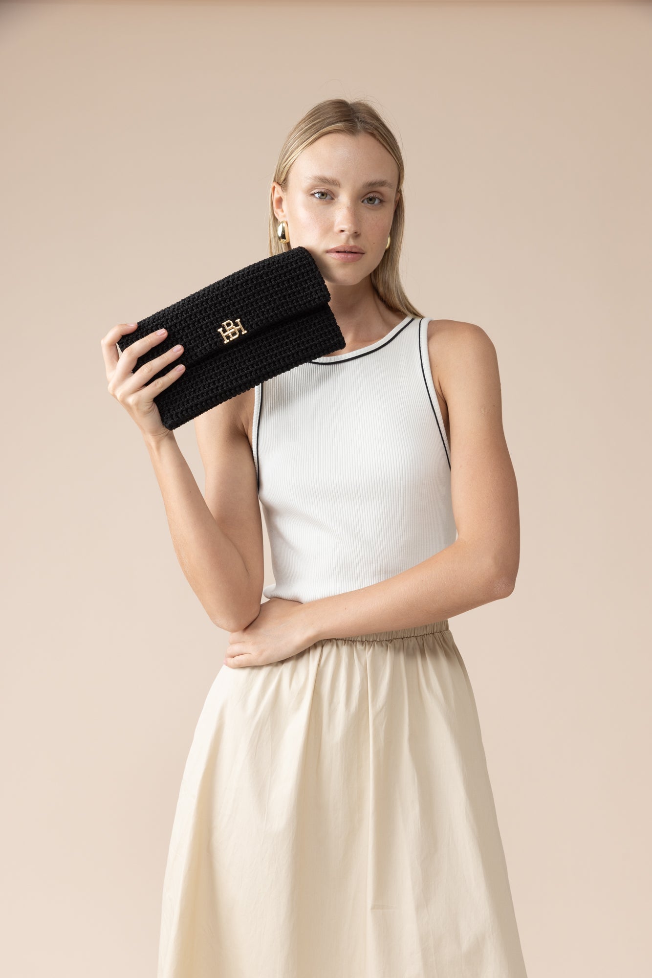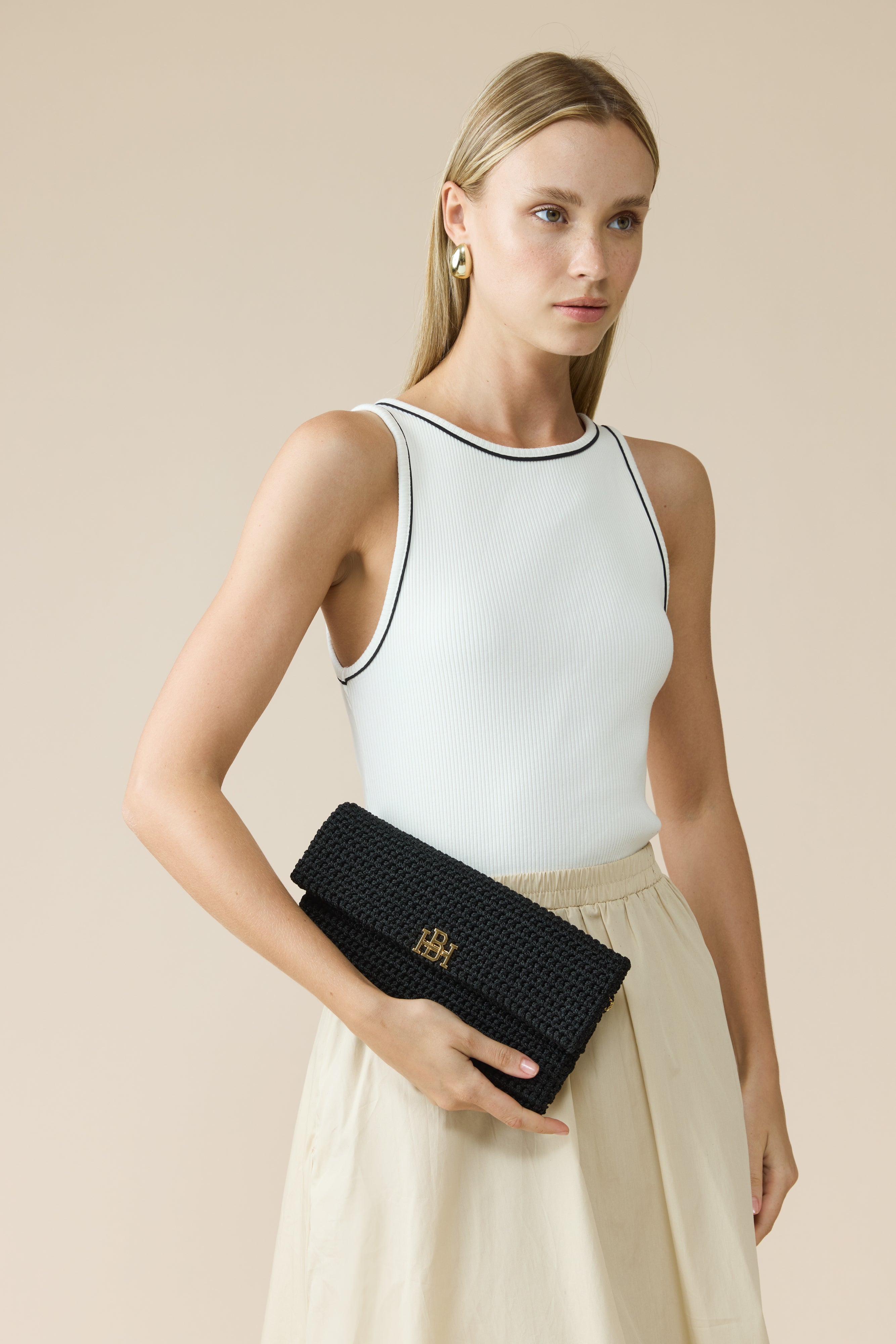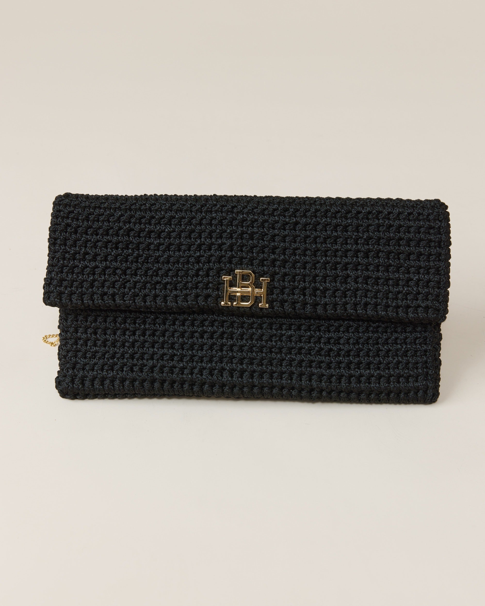 הוא תיק קלאץ' סרוג בעבודת יד בצבע שחור בגזרת מעטפה שטוחה. כולל רצועת שרשרת דקה לנשיאה על הכתף, וניתן לשימוש גם כקלאץ' יד. מתאים בעיקר לאירועים ולשעות הערב. התיק סגור בסגירה מגנטית ומעוטר בלוגו מוזהב בחזית. מכיל טלפון, כרטיסים ופריטים שטוחים