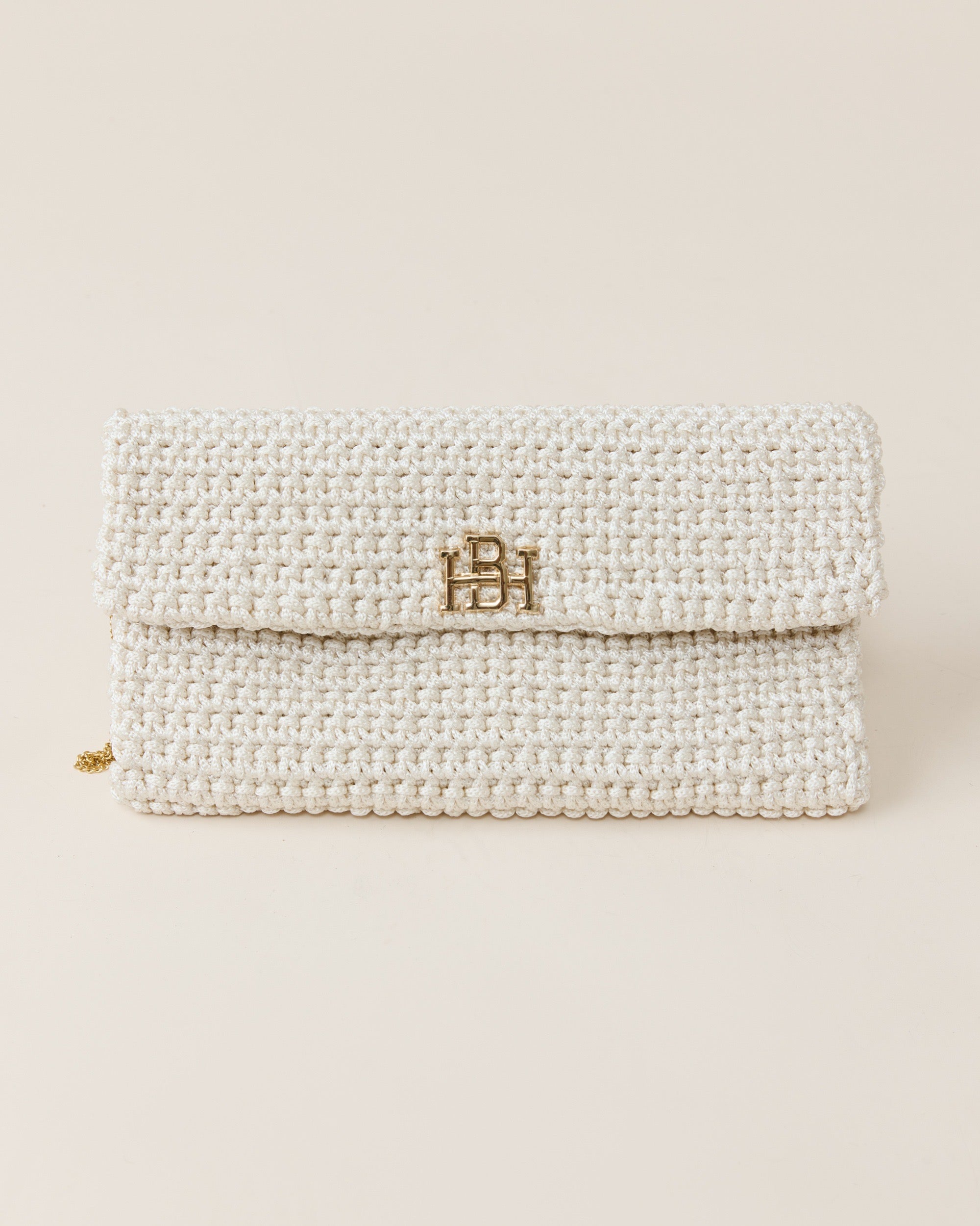 הוא תיק קלאץ' סרוג בעבודת יד בצבע שמנת בגזרת מעטפה שטוחה. כולל רצועת שרשרת דקה לנשיאה על הכתף, וניתן לשימוש גם כקלאץ' יד. מתאים בעיקר לאירועים ולשעות הערב. התיק סגור בסגירה מגנטית ומעוטר בלוגו מוזהב בחזית. מכיל טלפון, כרטיסים ופריטים שטוחים