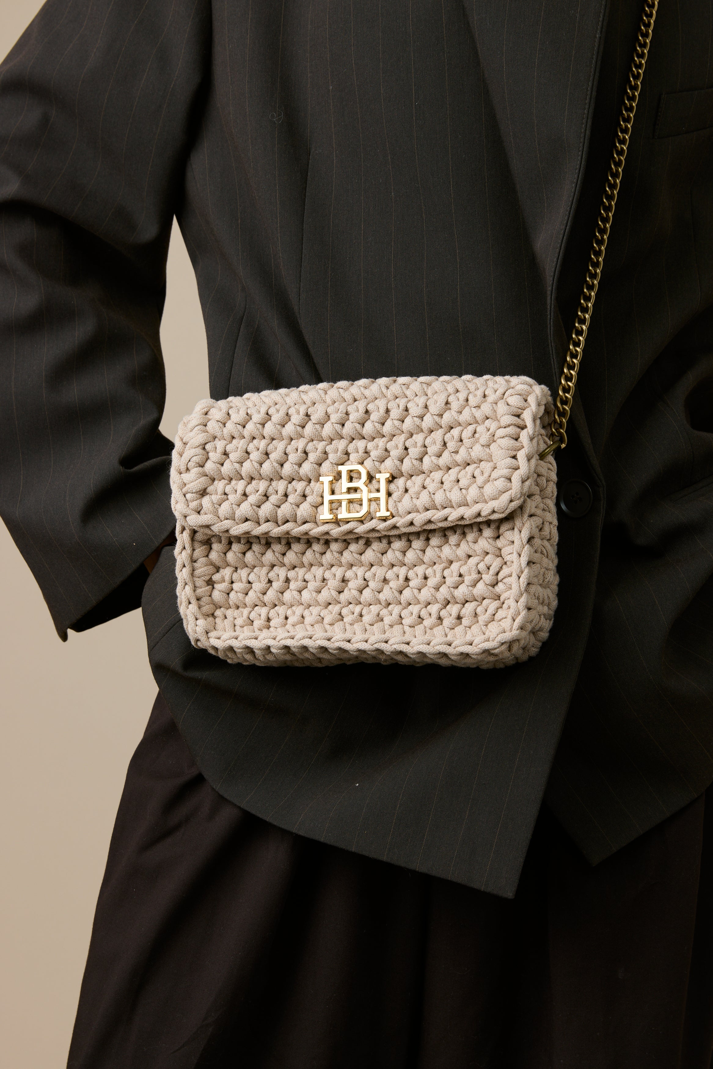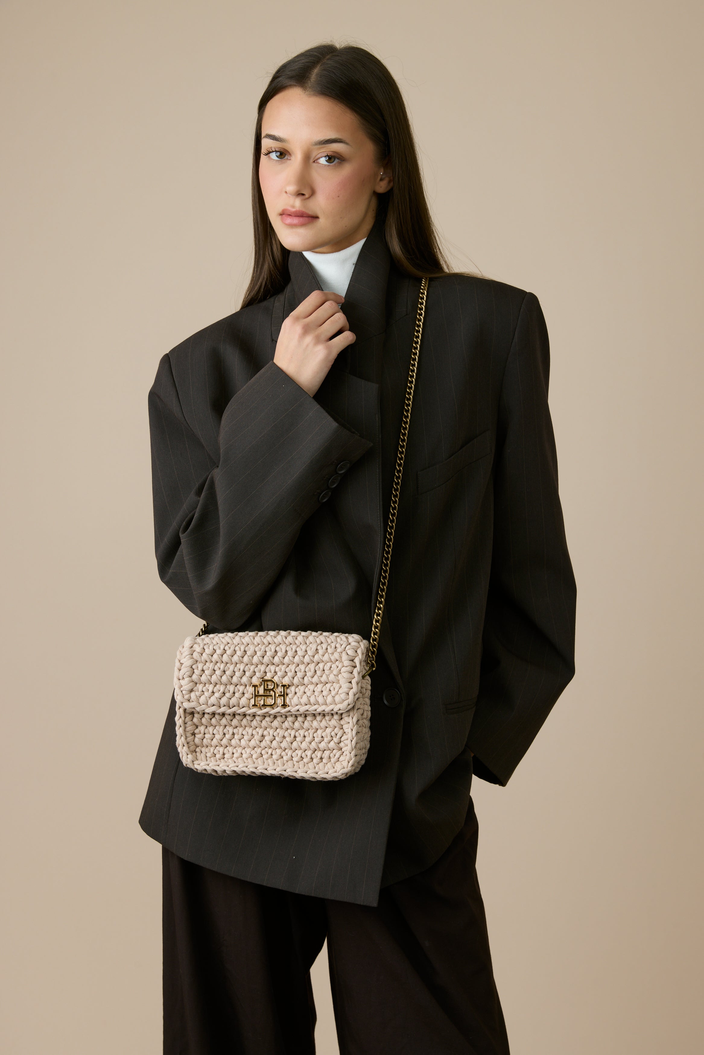 תיק קרוס-באדי סרוג בעבודת יד מחוט כותנה איכותי, בצבע ניוד . הגרסה המוקטנת של דגם jess .האהוב בעיצוב פרקטי ושיקי.