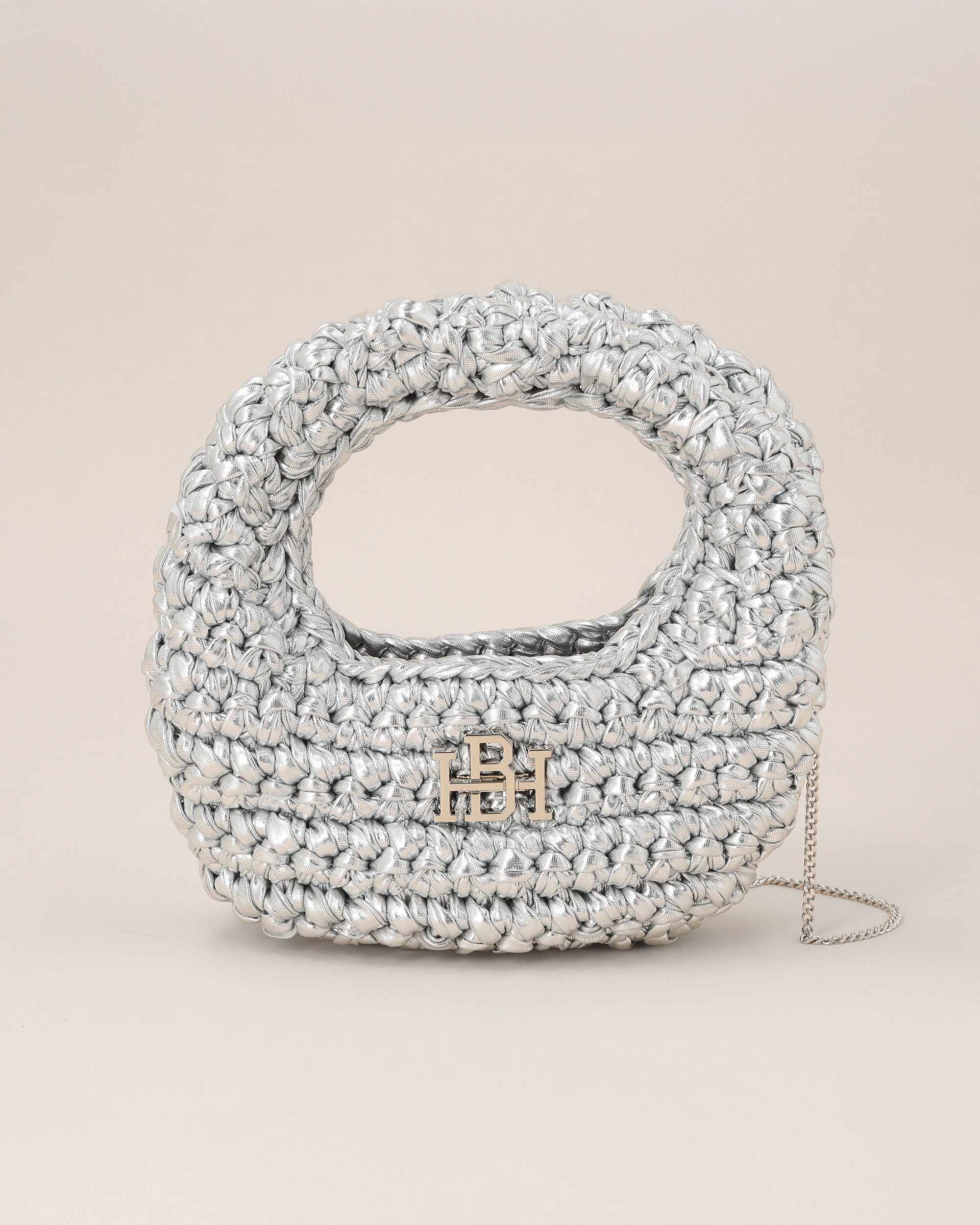 .תיק סרוג בגזרת ירח קלאסית, עשוי בעבודת יד מחוט מטאליק שמעניק לו מראה ייחודי ויוקרתי במיוחד
