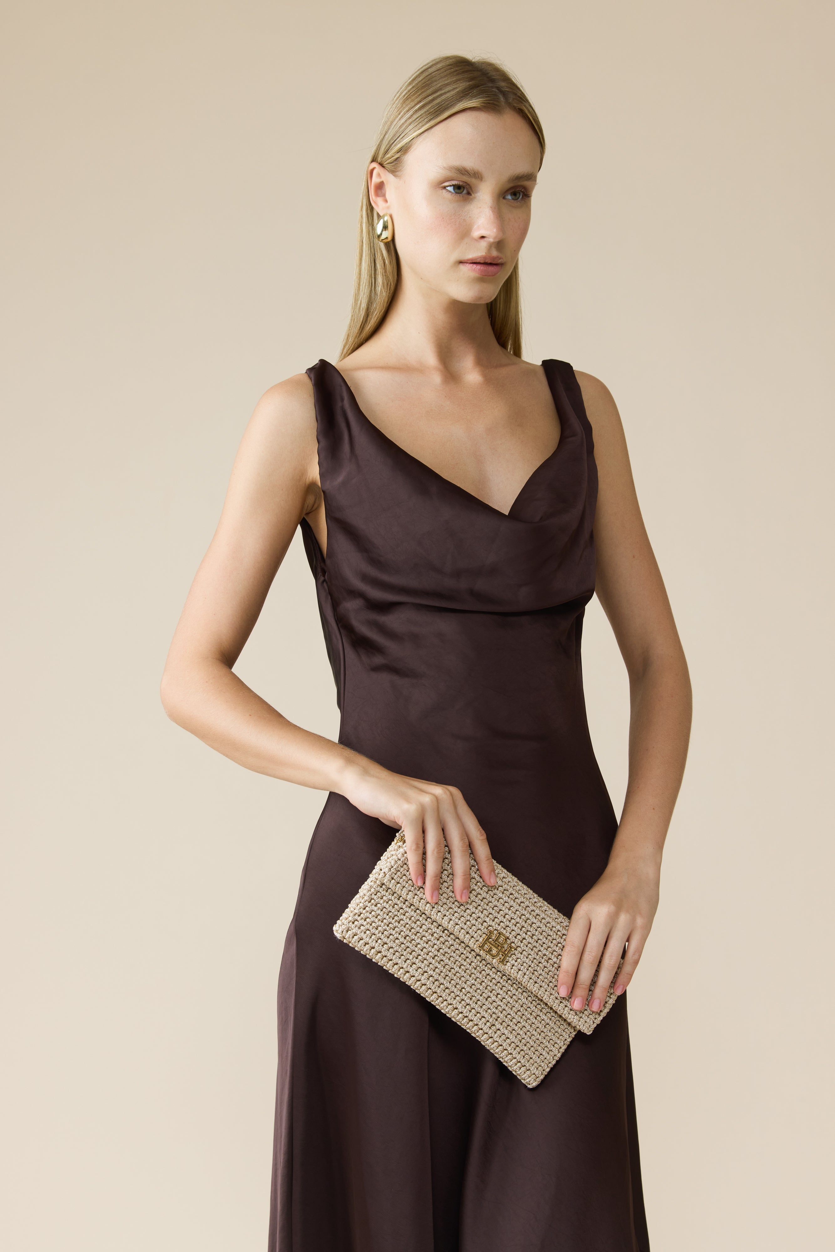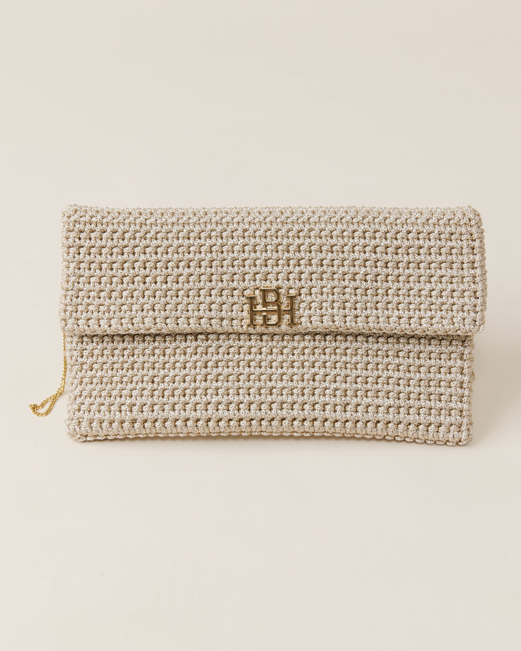 הוא תיק קלאץ' סרוג בעבודת יד בצבע שמפנייה בגזרת מעטפה שטוחה. כולל רצועת שרשרת דקה לנשיאה על הכתף, וניתן לשימוש גם כקלאץ' יד. מתאים בעיקר לאירועים ולשעות הערב. התיק סגור בסגירה מגנטית ומעוטר בלוגו מוזהב/כסוף בחזית. מכיל טלפון, כרטיסים ופריטים שטוחים